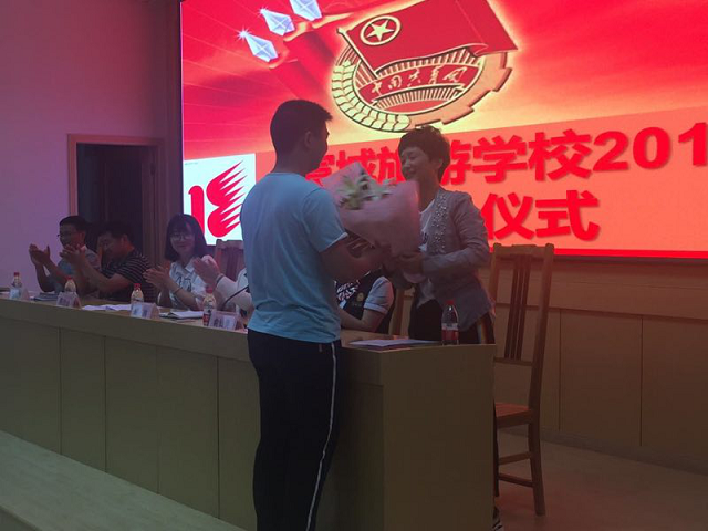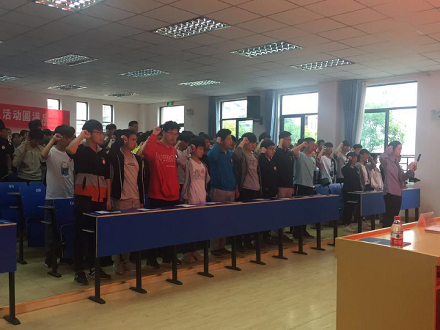 面向国旗,佩戴成人纪念章,全体学生在学生会主席杜任然的带领下,庄严宣誓!